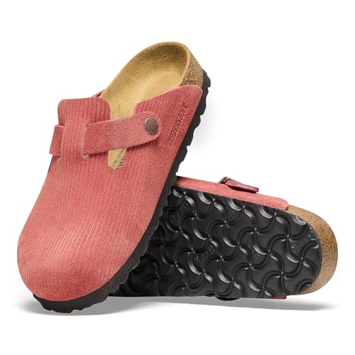 The clogs are made from embossed suede that mimics the style of corduroy, providing a soft yet durable quality.