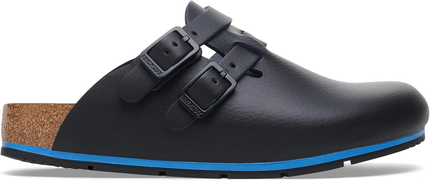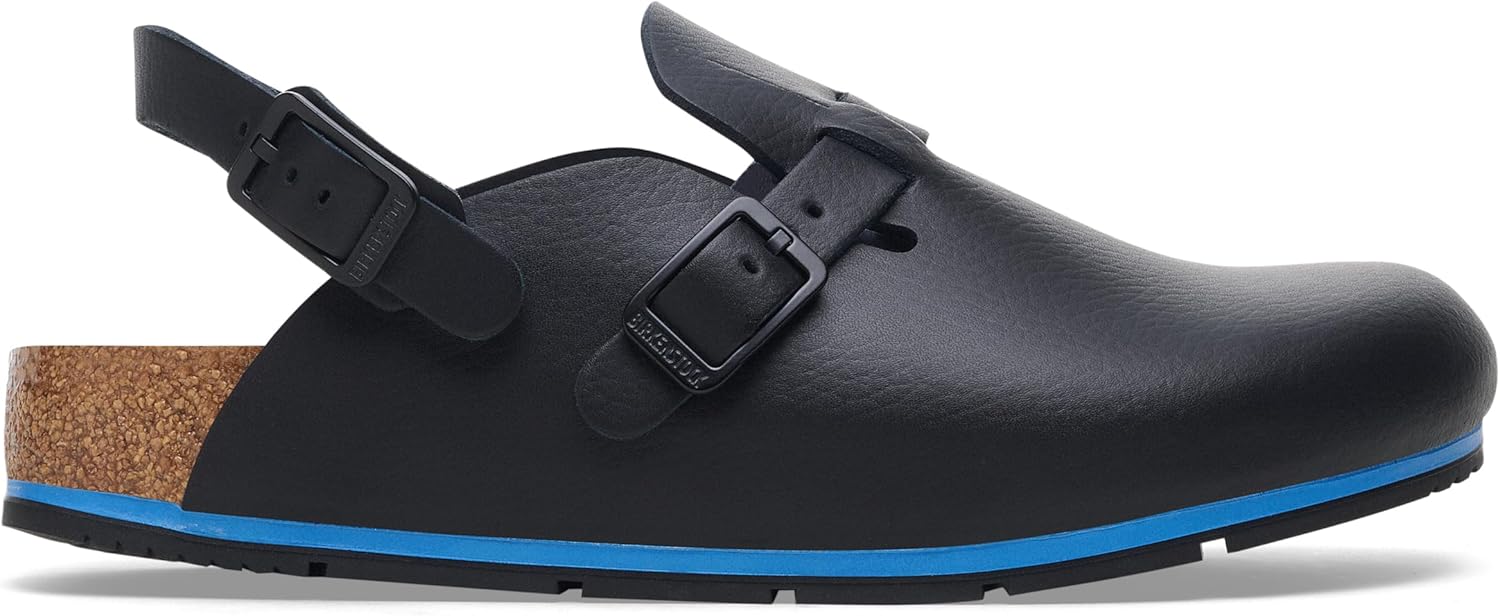 BIRKENSTOCK Kay Pro leather clogs – high-quality leisure and work shoes for medicine, catering and service. The BIRKENSTOCK Kay Pro is a real classic, certified as a work shoe according to EN ISO 20347:2022 and is therefore versatile. The clogs are equipped with a special cushioning midsole made of polyurethane (PU), while the outsole is made of thermoplastic polyurethane (TPU) and is therefore particularly non-slip. The upper material is made of high-quality, soft natural leather, which is also coated with polyurethane (PU) and is therefore dirt-repellent and easy to clean. The foldable, adjustable heel strap ensures that the shoe sits securely and securely even in demanding situations. Thanks to the classic Birkenstock buckle, the Kay Pro can be adjusted exactly to your foot, while the cork footbed supports and relieves the foot. All Kay Pro models have been tested according to the specifications of EN ISO 20347:2022. Areas of application include: Service personnel Medicine, hospital (doctors, nursing staff), pharmacies, veterinary medicine. Kitchen, catering, catering. leisure.