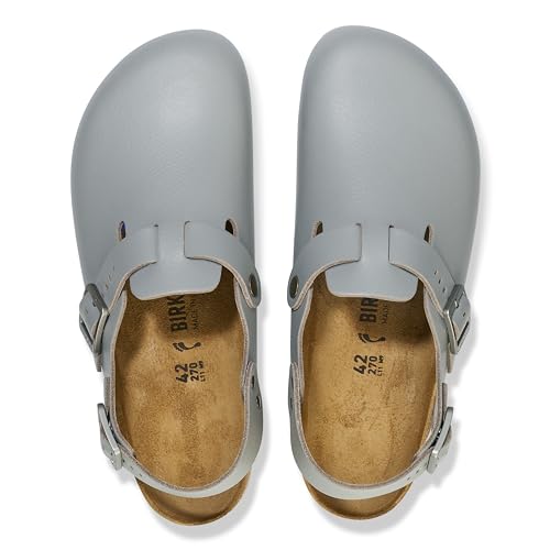 BIRKENSTOCK Tokio Pro leather clogs – high-quality leisure and work shoes for medicine, catering and service. The BIRKENSTOCK Tokio Pro is a real classic, certified as a work shoe according to EN ISO 20347:2022 and is therefore versatile. The clogs are equipped with a special cushioning midsole made of polyurethane (PU), while the outsole is made of thermoplastic polyurethane (TPU) and is therefore particularly non-slip. The upper material is made of high-quality, soft natural leather, which is also coated with polyurethane (PU) and is therefore dirt-repellent and easy to clean. The adjustable heel strap ensures that the shoe sits securely and firmly even in demanding situations. Thanks to the classic Birkenstock buckle, the Tokio Pro can be adjusted exactly to your foot, while the cork footbed supports and relieves the foot. All Tokio Pro models have been tested according to the specifications of EN ISO 20347:2022. Areas of application include: Service personnel Medicine, hospital (doctors, nursing staff), pharmacies, veterinary medicine. Kitchen, catering, catering. leisure.