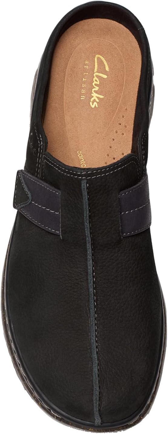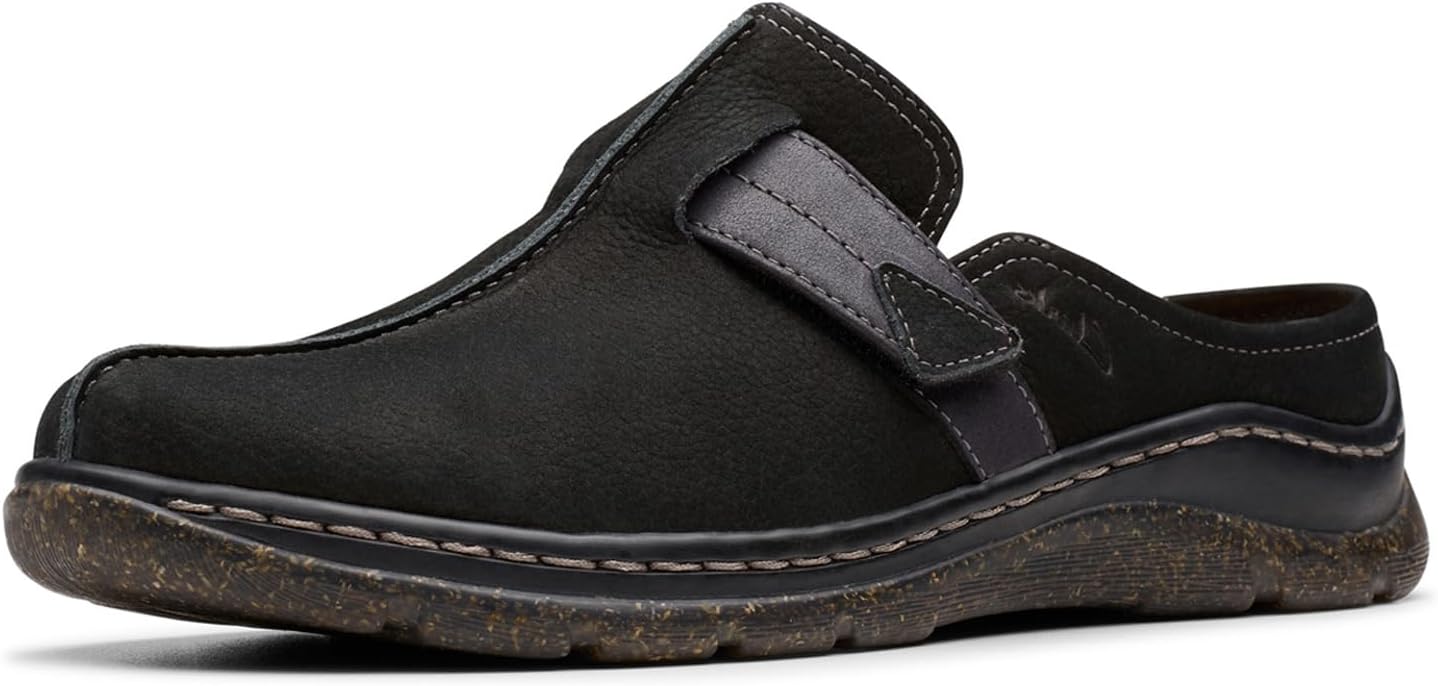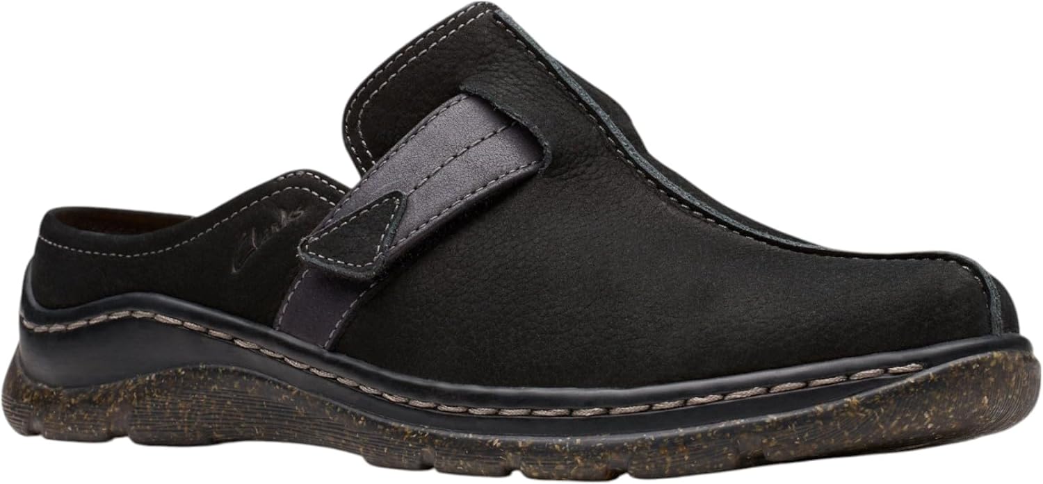 Clarks Orlene Clog makes a top pick for casual style this season. Crafted with soft nubucks and leathers, this slip-on profile delivers elevated comfort and versatile everyday wear. The rice husk sole delivers a unique look, while a streamlined, motion-inspired silhouette lends a sporty finish. – Premium black nubuck upper with tonal leather trim – Moulded Contour Cushion footbed offers unrivalled underfoot comfort – Side-stitch detail offers a crafted, casual feel and enhances durability – Rice-husk-flecked, two-layer TPR (thermoplastic rubber) outsole is lightweight and impact absorbing