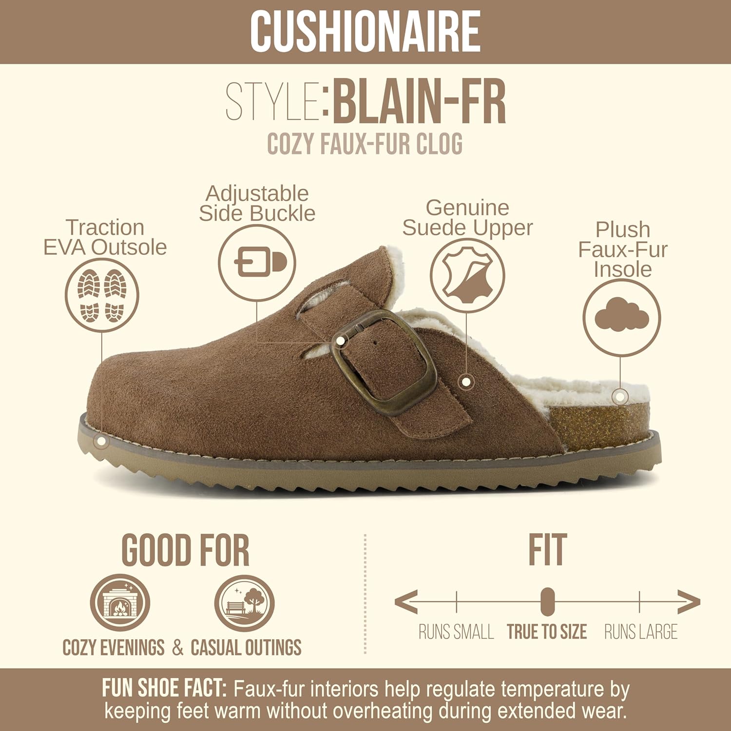 tep into cozy confidence with the CUSHIONAIRE Blain Fur, a true essential among fall fashion must haves. These genuine suede clogs blend comfort and craftsmanship, making them a go-to favorite for anyone who values warmth and effortless style. The plush faux shearling lining wraps your feet in softness, creating a feel that rivals even the coziest potato shoes — light, flexible, and undeniably comfortable. Every detail, from the fine stitching to the easy slip-on silhouette, reflects thoughtful design meant for real-life wear. Perfectly balanced between womens shoes and casual comfort, the Blain Fur transitions easily from lounging indoors to stepping out for a crisp autumn stroll. With its timeless design and premium materials, it’s a beautiful example of women’s mules & clogs done right — simple, durable, and endlessly versatile. Whether you’re sipping coffee on a cool morning or heading out for weekend errands, these clogs wrap your day in warmth and understated style. The Blain Fur isn’t just footwear; it’s a cozy invitation to slow down, stay grounded, and feel at home wherever you go.