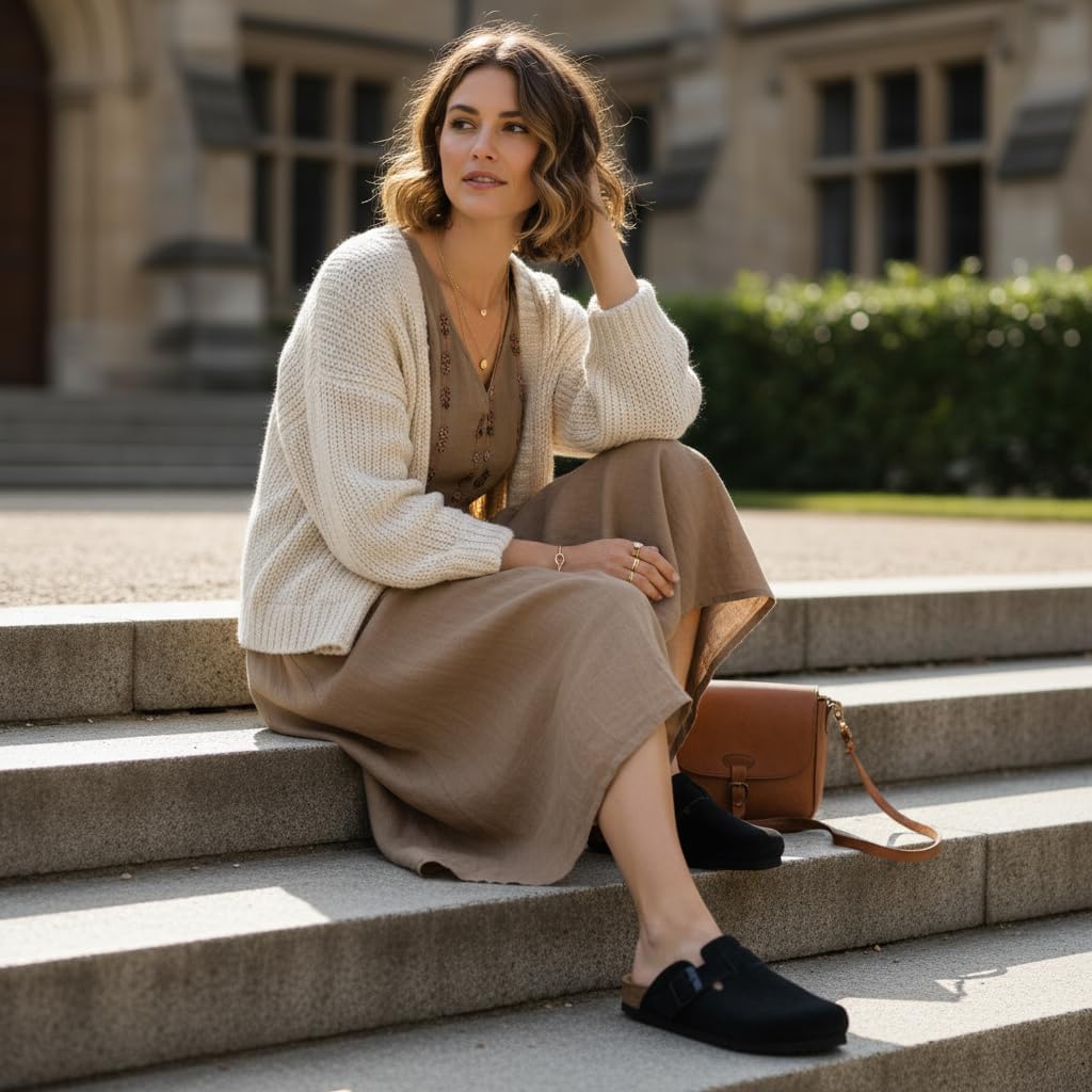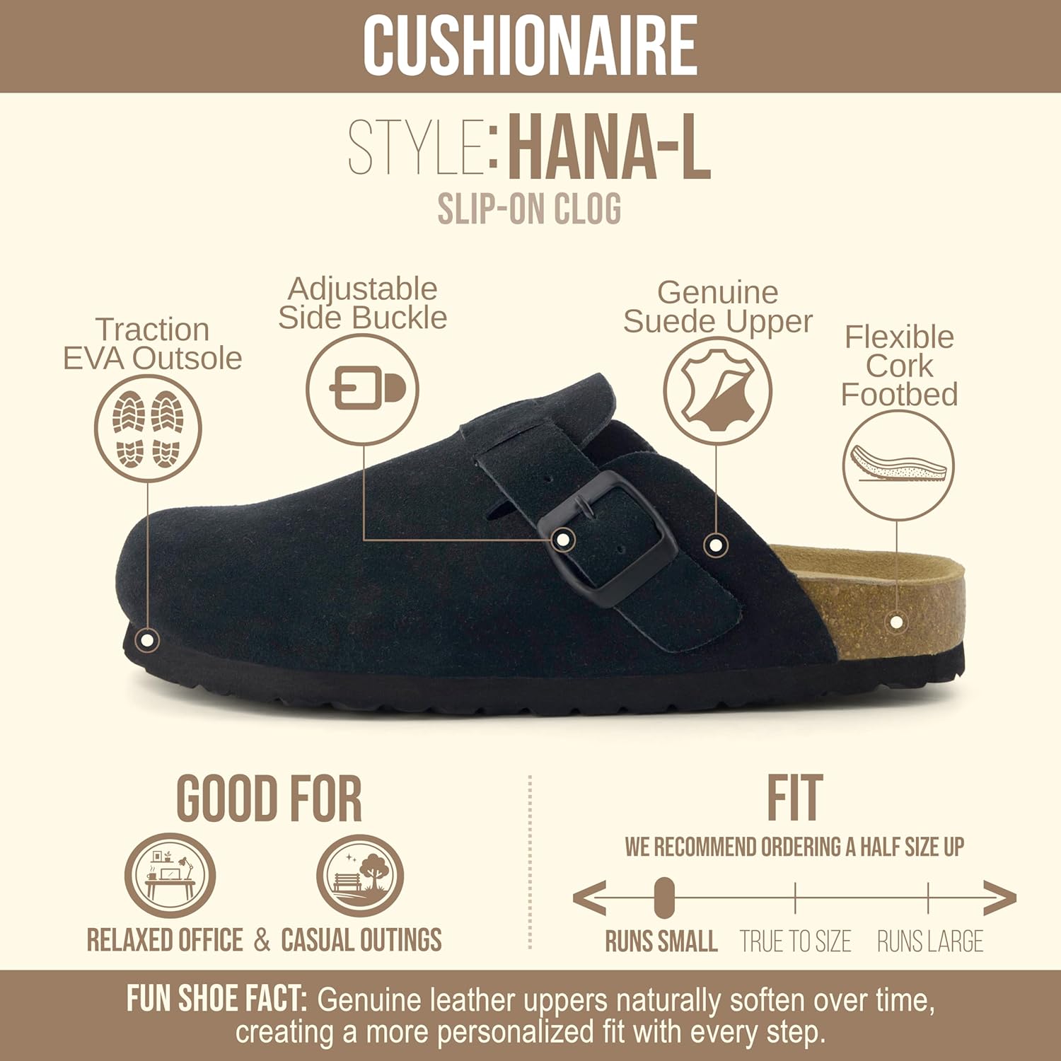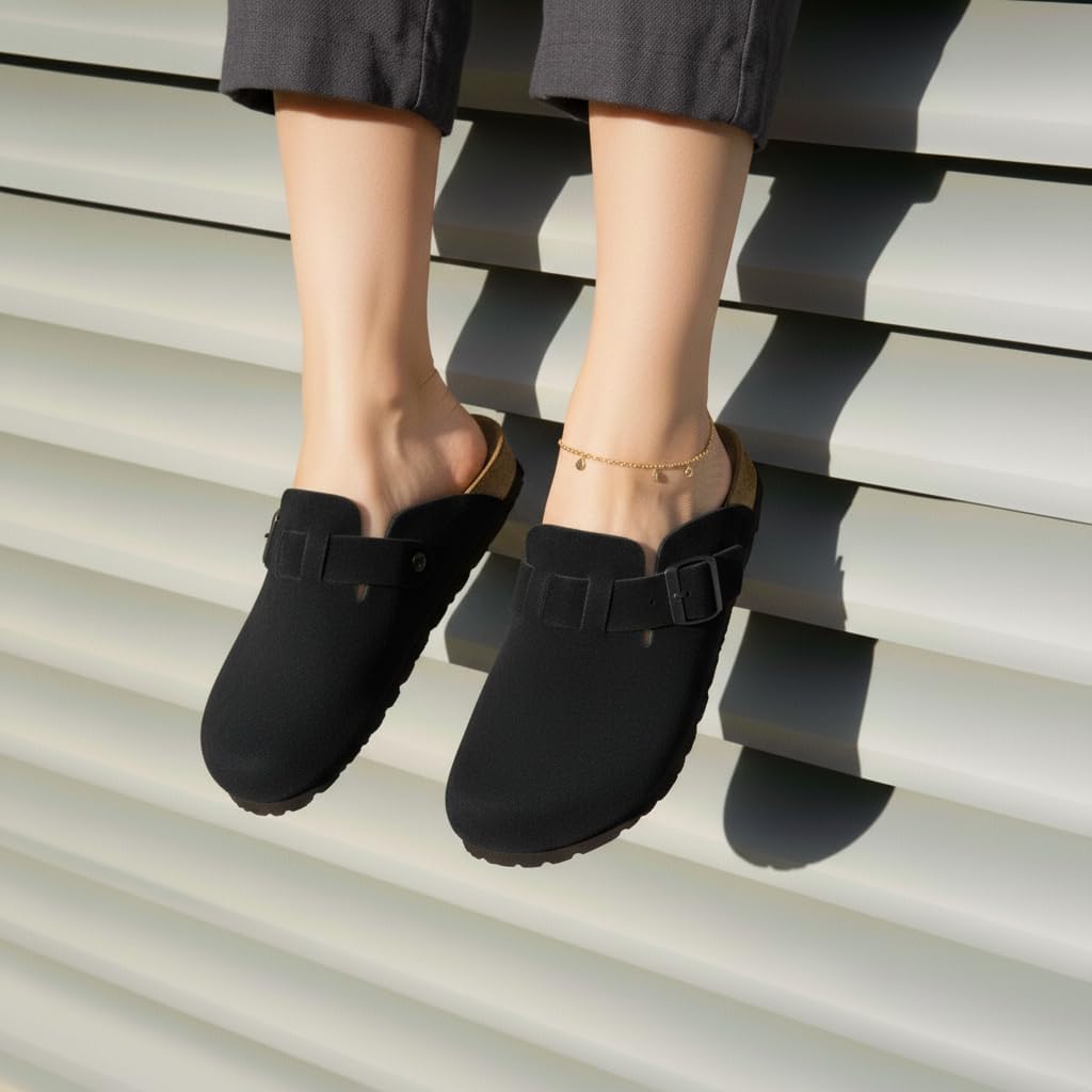 Step into comfort with the CUSHIONAIRE Hana, a versatile clog crafted from soft genuine suede. These suede clogs feature a contoured footbed that cushions every step, making them a reliable choice for work, errands, or evenings at home. The slip-on silhouette combines ease and support, giving you an effortless style that pairs with denim, trousers, or cozy layers. Designed for everyday wear, Hana works as both stylish womens mules and durable womens house shoes. The clean profile offers the coverage of closed toe sandals women can wear with ease, while still delivering the lightweight comfort of a mule. Quick to slip on, they provide the convenience of slip on slides for women with the polish of genuine suede craftsmanship. With a stable sole and roomy fit, they offer the comfort of slippers while maintaining structure for all-day use. The versatile outsole transitions easily from indoors to outdoors, so your comfort goes wherever you do. Whether styled as womens mules, relaxed womens house shoes, or classic suede clogs, Hana delivers lasting support and timeless appeal.