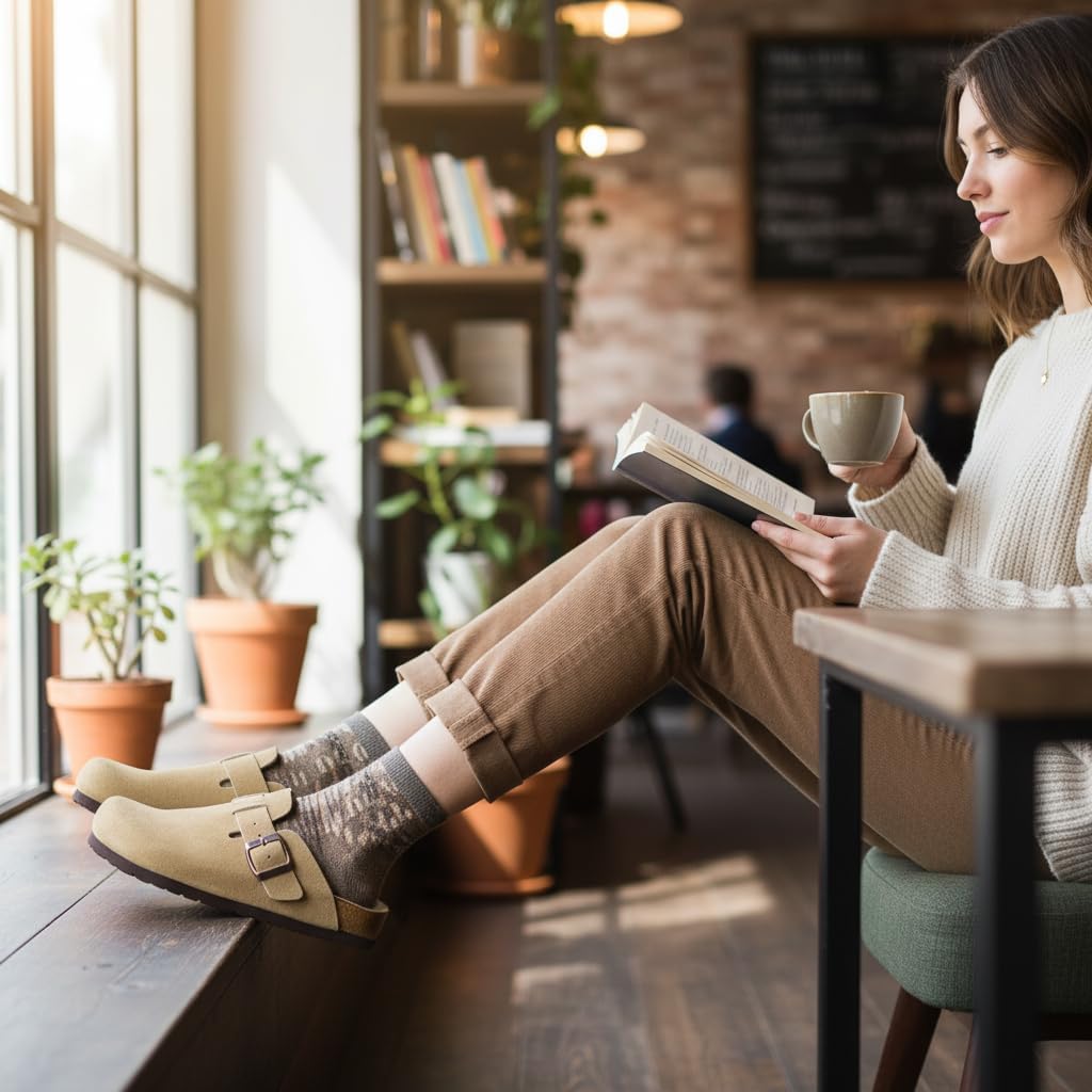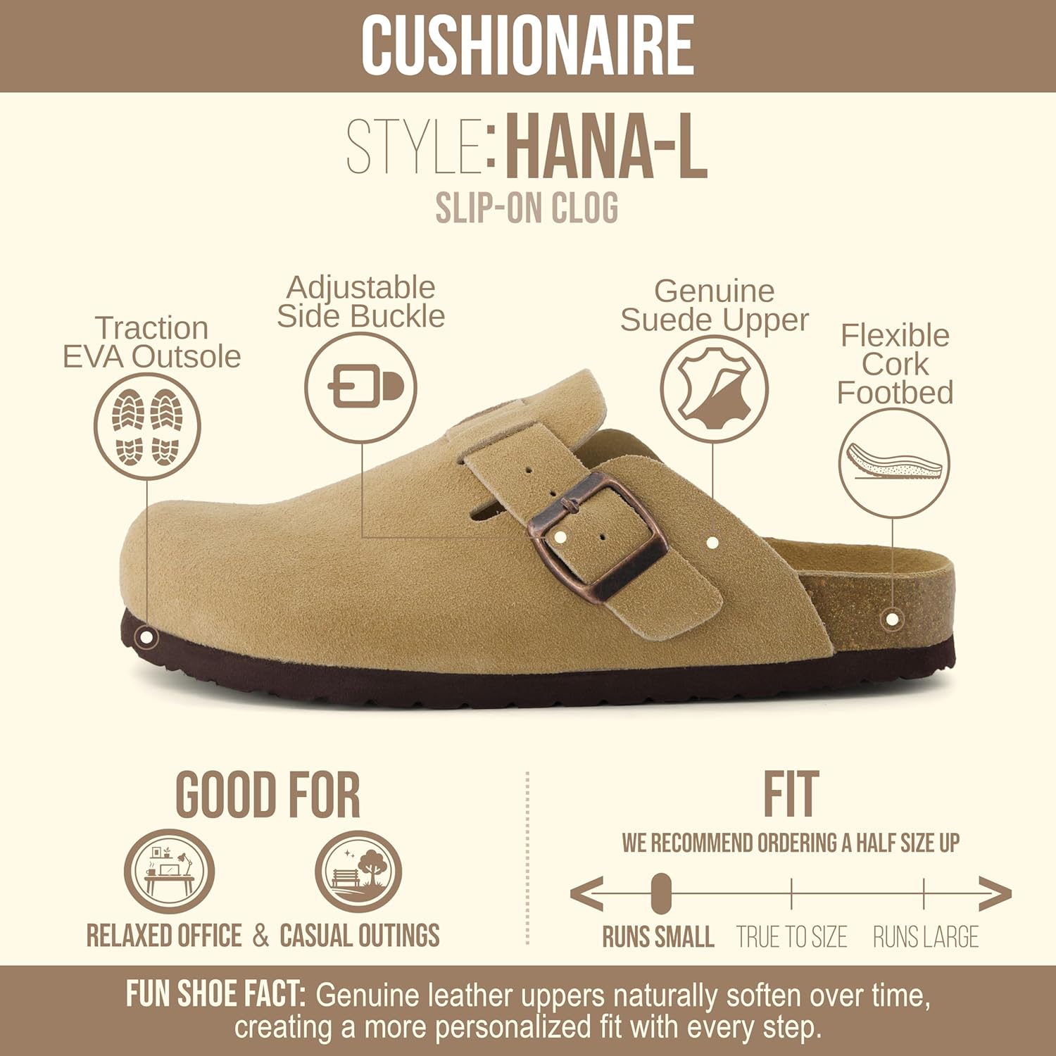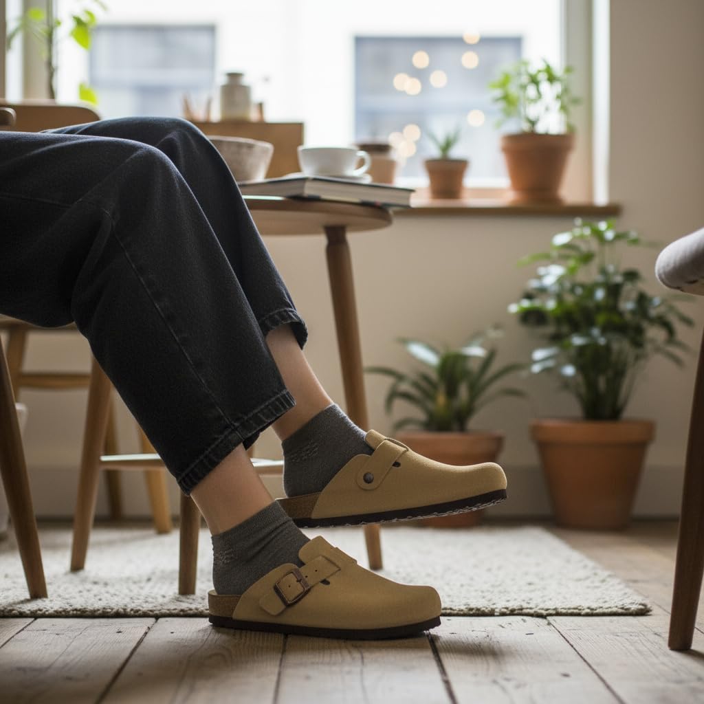 Step into comfort with the CUSHIONAIRE Hana, a versatile clog crafted from soft genuine suede. These suede clogs feature a contoured footbed that cushions every step, making them a reliable choice for work, errands, or evenings at home. The slip-on silhouette combines ease and support, giving you an effortless style that pairs with denim, trousers, or cozy layers. Designed for everyday wear, Hana works as both stylish womens mules and durable womens house shoes. The clean profile offers the coverage of closed toe sandals women can wear with ease, while still delivering the lightweight comfort of a mule. Quick to slip on, they provide the convenience of slip on slides for women with the polish of genuine suede craftsmanship. With a stable sole and roomy fit, they offer the comfort of slippers while maintaining structure for all-day use. The versatile outsole transitions easily from indoors to outdoors, so your comfort goes wherever you do. Whether styled as womens mules, relaxed womens house shoes, or classic suede clogs, Hana delivers lasting support and timeless appeal.