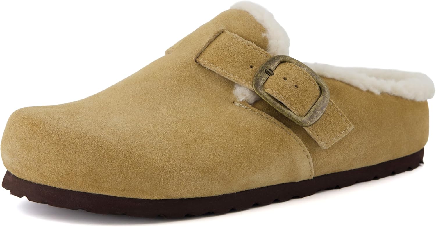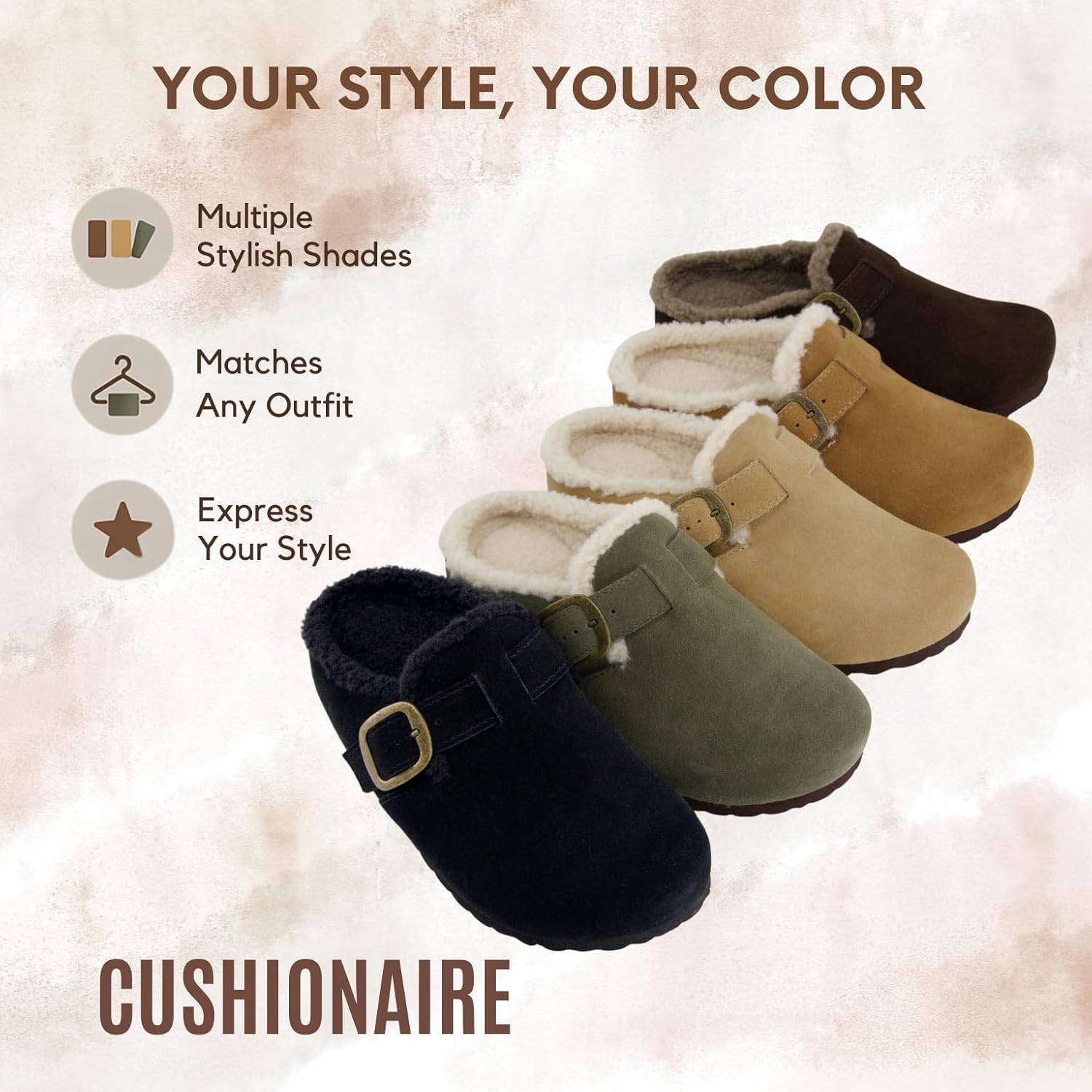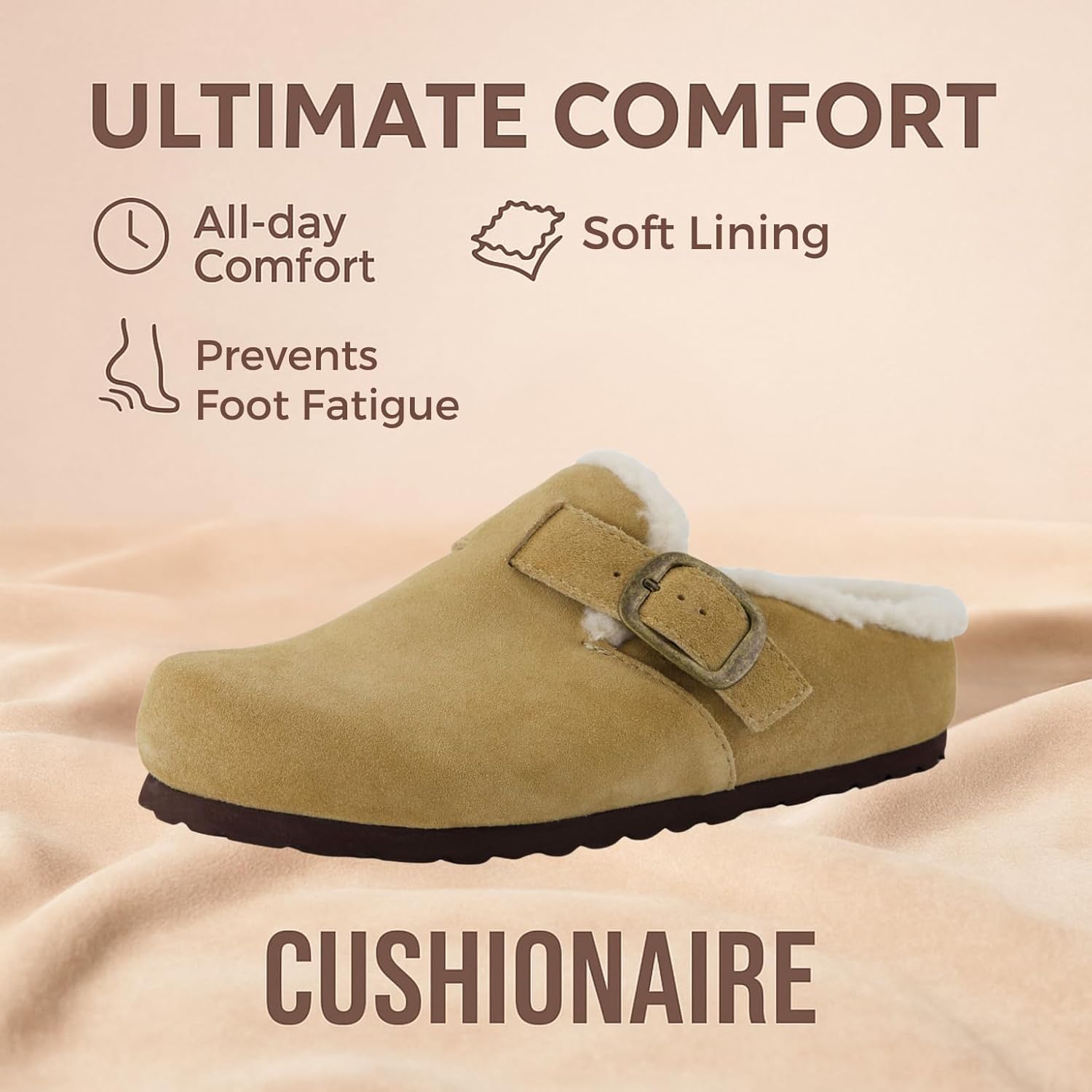 CUSHIONAIRE Haven Genuine Leather Clogs for Women – Faux Fur Lined Slip-On Womens Shoes with Cork Footbed and Adjustable Buckle