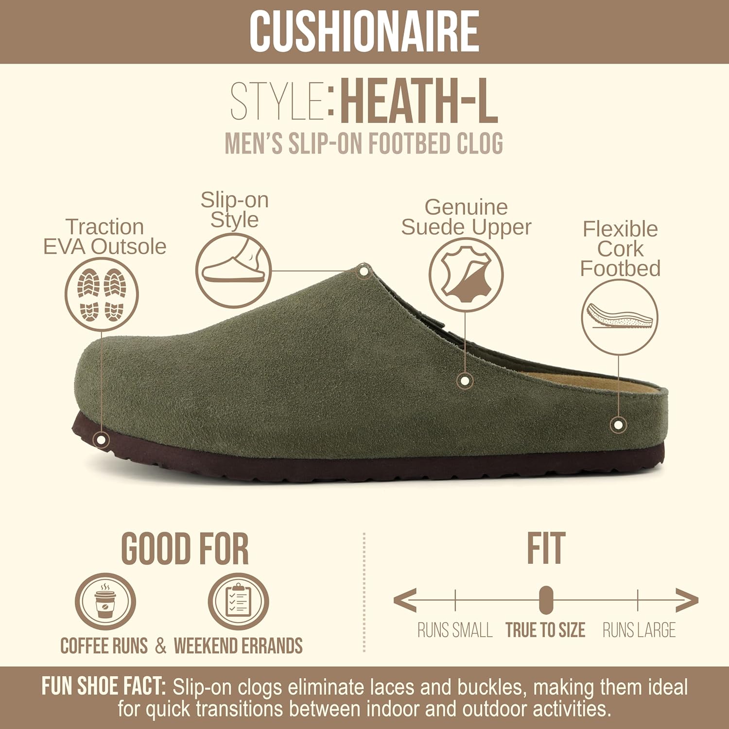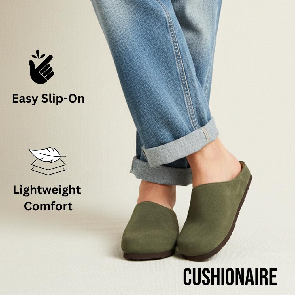 Step into all-day comfort and timeless design with the CUSHIONAIRE Heath Genuine Suede Leather Mens Clogs. Blending effortless wear with modern simplicity, these shoes are a versatile staple for your everyday routine. The soft suede upper and cushioned footbed provide a plush feel that makes them just as comfortable as your favorite men slippers, yet durable enough for light outdoor wear. Perfect for cooler days, the supportive construction and covered toe make these ideal shoes for winter or crisp fall mornings. A memory foam footbed contours to your feet, delivering personalized comfort with every step, while the lightweight sole ensures easy movement indoors or out. Whether you’re running quick errands, lounging at home, or stepping out for a relaxed weekend, these men clogs deliver cozy support that never compromises on style. With their clean lines and versatile design, the Heath Leather Mules are a smart addition to any wardrobe and one of this season’s fall fashion must haves. Designed to match the effortless vibe of laid-back dressing, they even embrace the comfort trend often called potato shoes — footwear that feels as soft and easy as slipping into your favorite pair of socks. Functional, minimal, and refined, these clogs are made for men who value lasting comfort and timeless appeal.