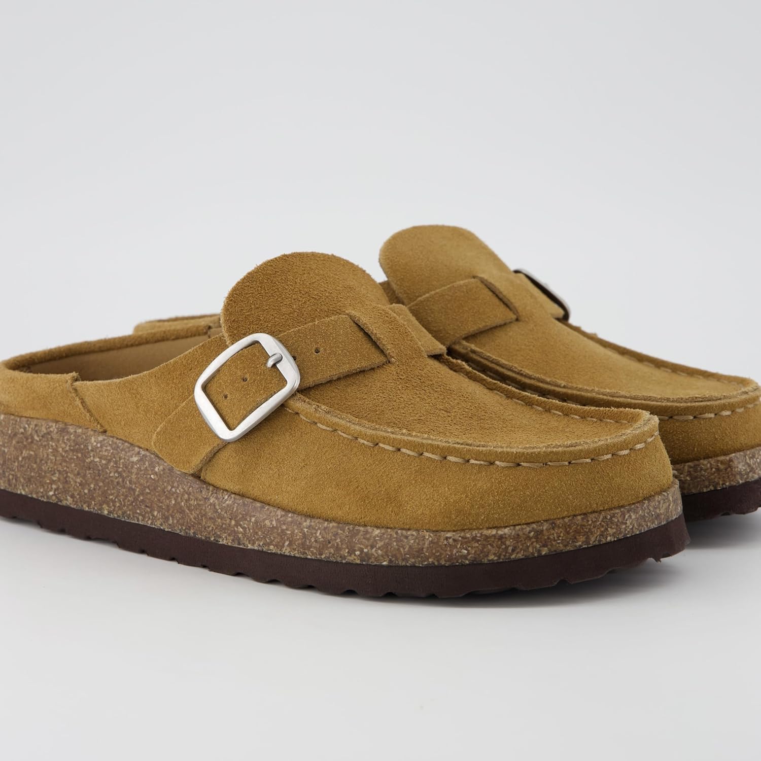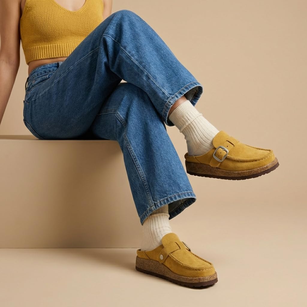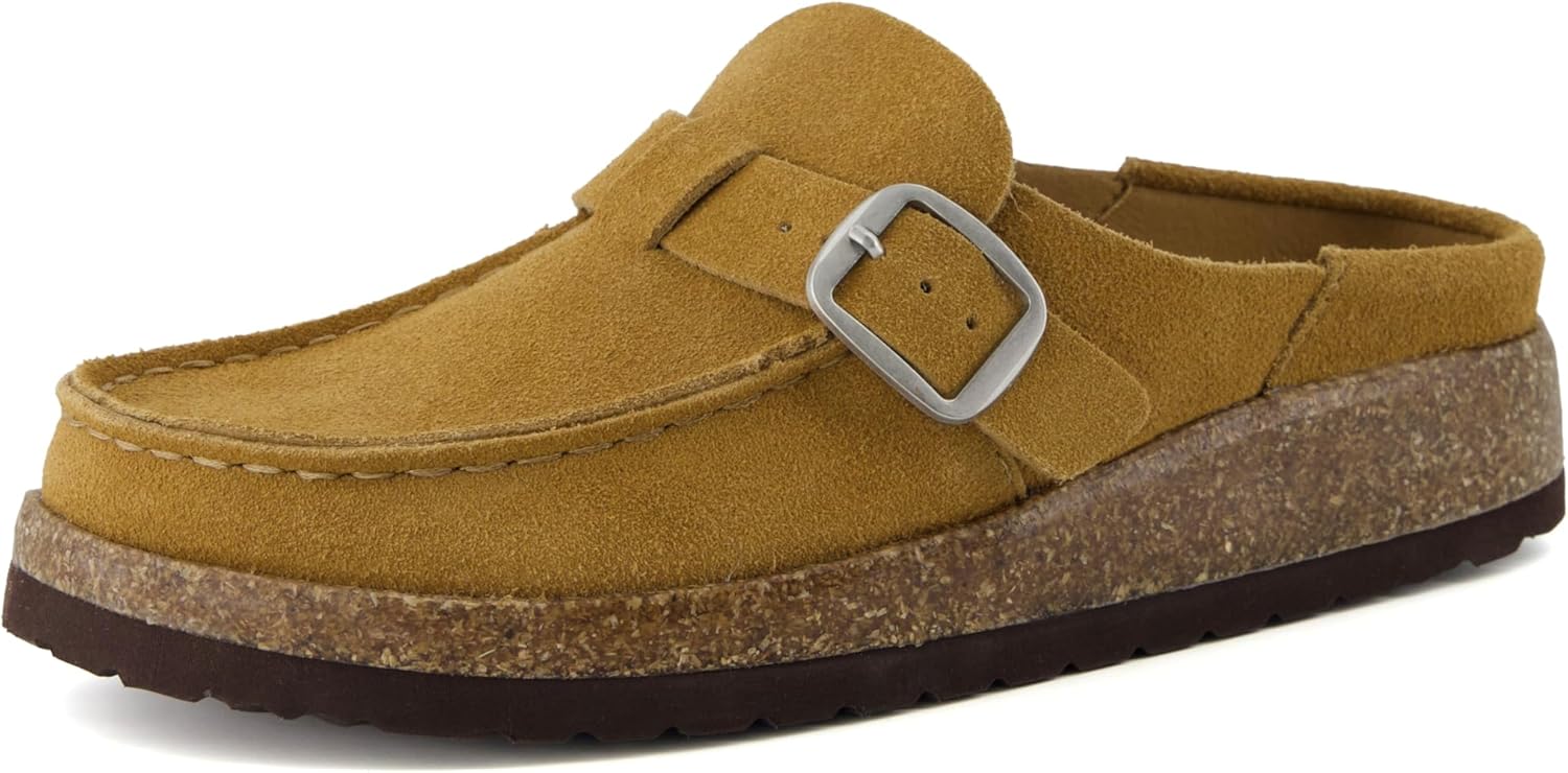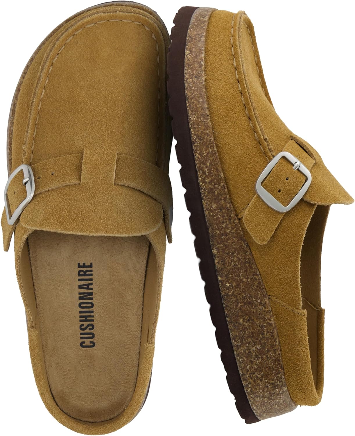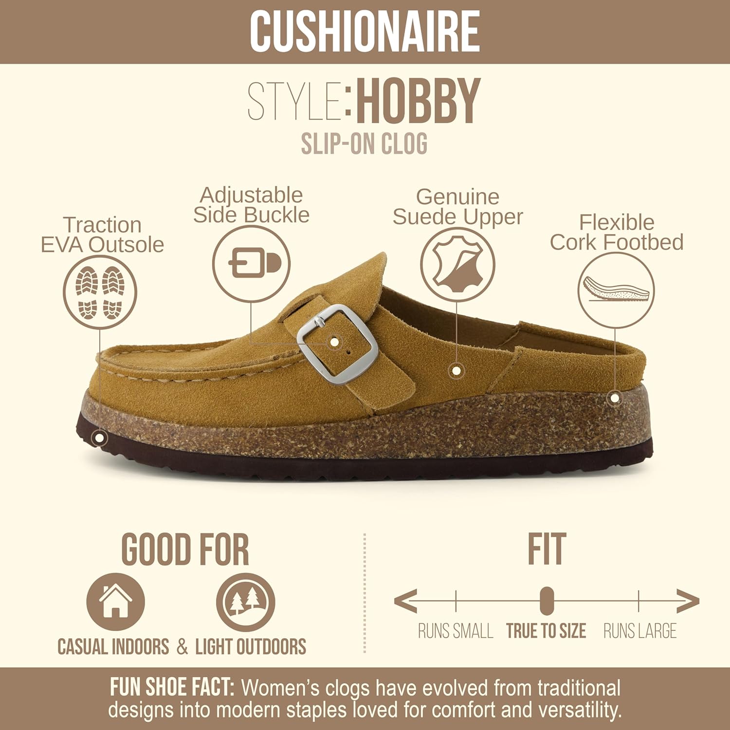 CUSHIONAIRE Hobby Genuine Leather Suede Mule Clogs for Women with Buckle Strap and Cork Footbed, Supportive All-Day Comfort in Womens Shoes