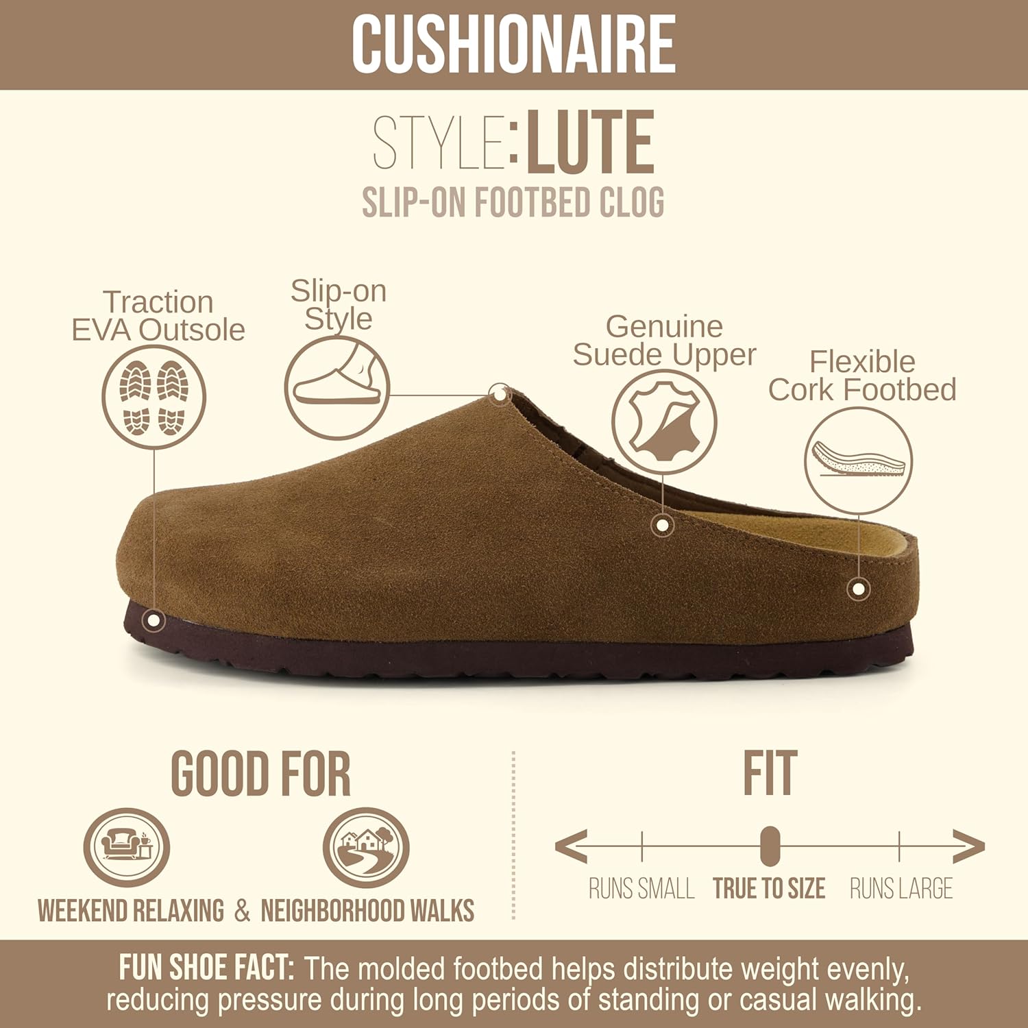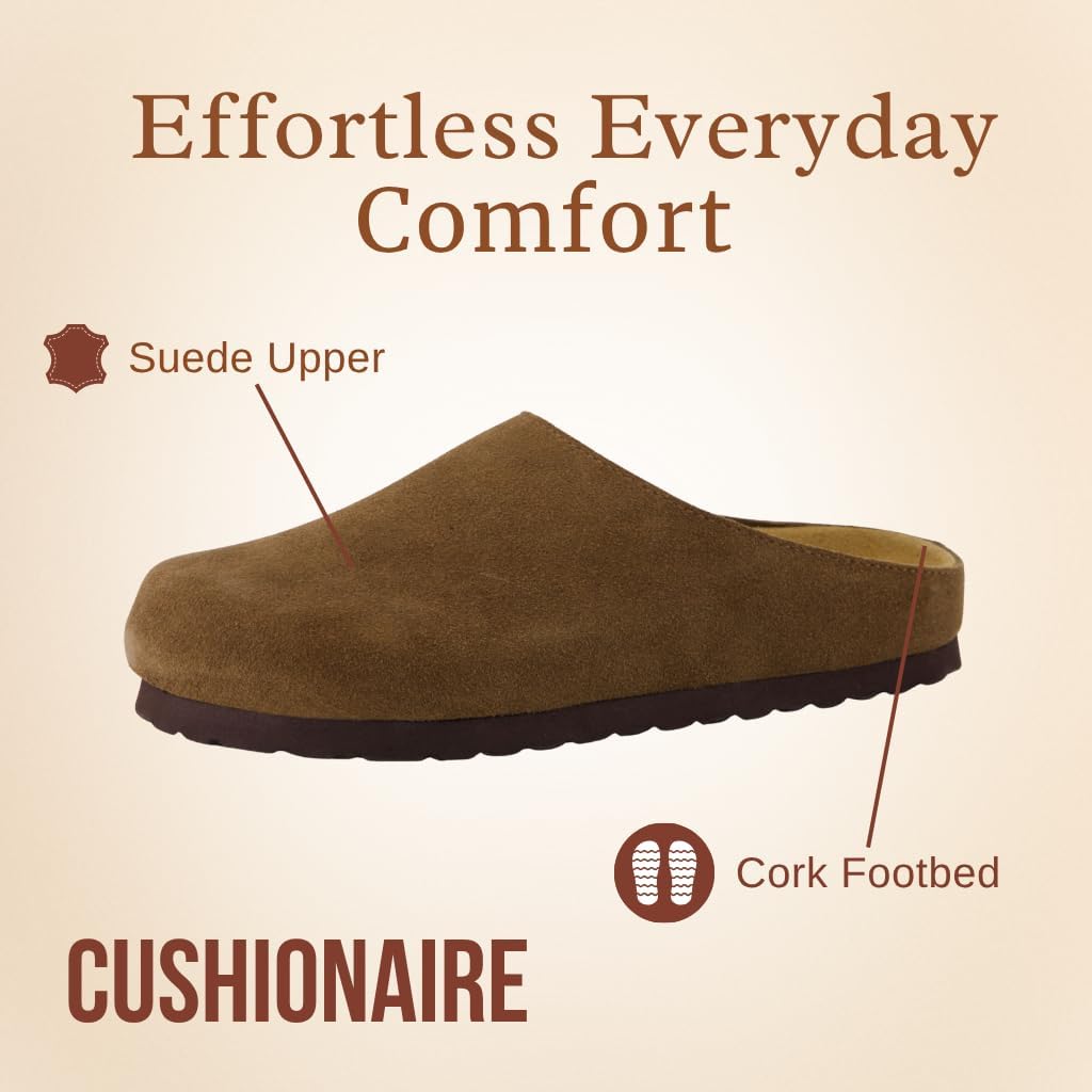 Step into effortless comfort with the CUSHIONAIRE Lute, a beautifully crafted clog made from genuine suede for a timeless, cozy look. Inspired by the relaxed feel of potato shoes, this style blends everyday ease with a premium cushioned footbed that supports you from morning to night. With a slip-on design and soft interior lining, it delivers the perfect mix of style and simplicity for daily wear. Designed for modern versatility, these fall shoes for women 2025 capture the essence of transitional comfort — great for crisp mornings, cozy evenings, and everything in between. Blending the effortless style of womens mules with the practicality of everyday footwear, the Lute keeps you comfortable while complementing jeans, leggings, or casual dresses. Each step feels supported and naturally balanced, thanks to flexible soles and thoughtful design details. Perfect for fans of women’s clogs who value comfort without compromise, the Lute doubles beautifully as clog slippers for women, providing dependable cushioning wherever your day takes you. Available in Black, Chestnut, Brown, Sand, and Dark Taupe, this suede essential pairs timeless craftsmanship with all-day wearability — a cozy, stylish favorite for every season.
