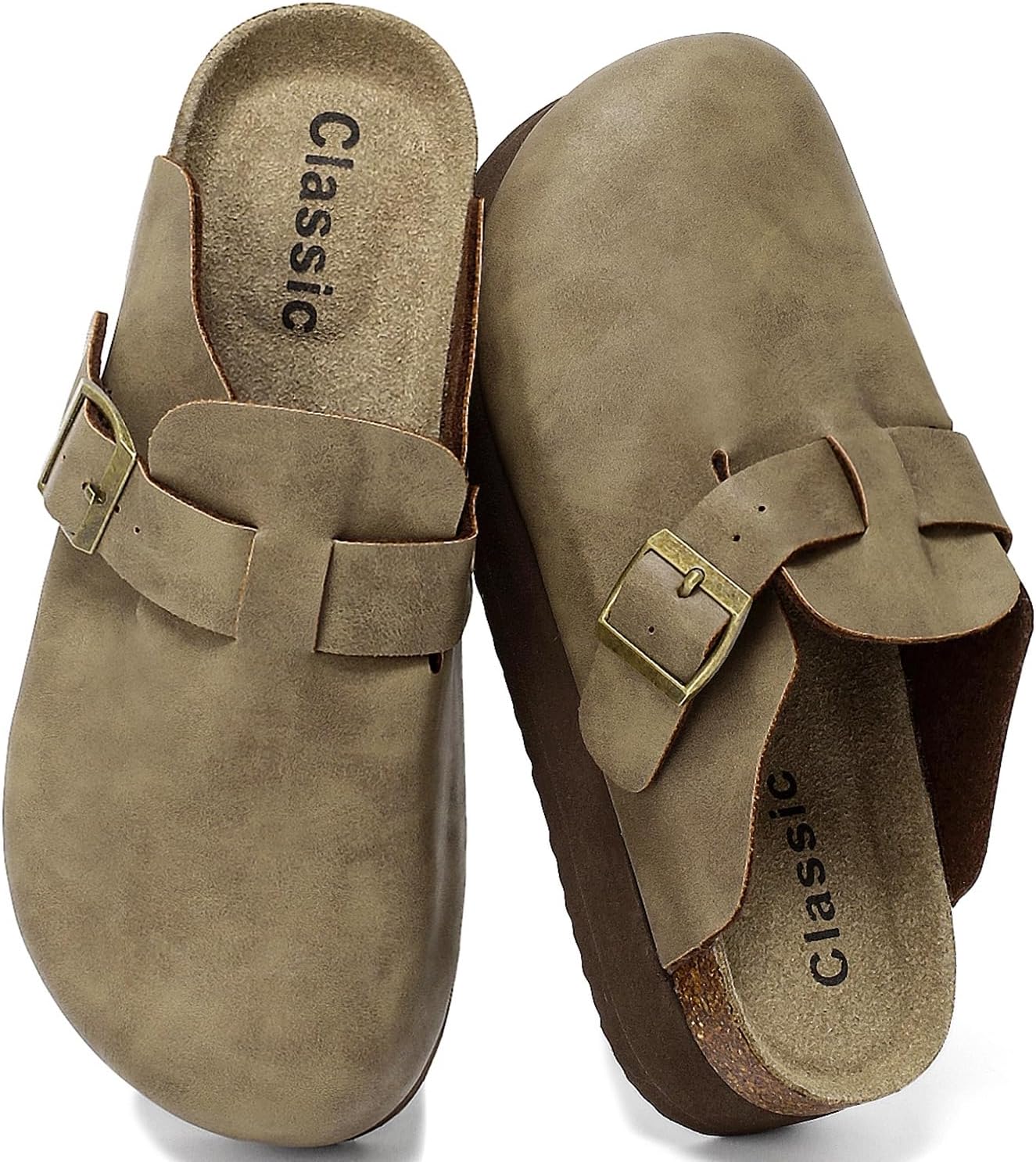 The clogs are made from genuine leather with a comfortable suede finish and feature a cork footbed.