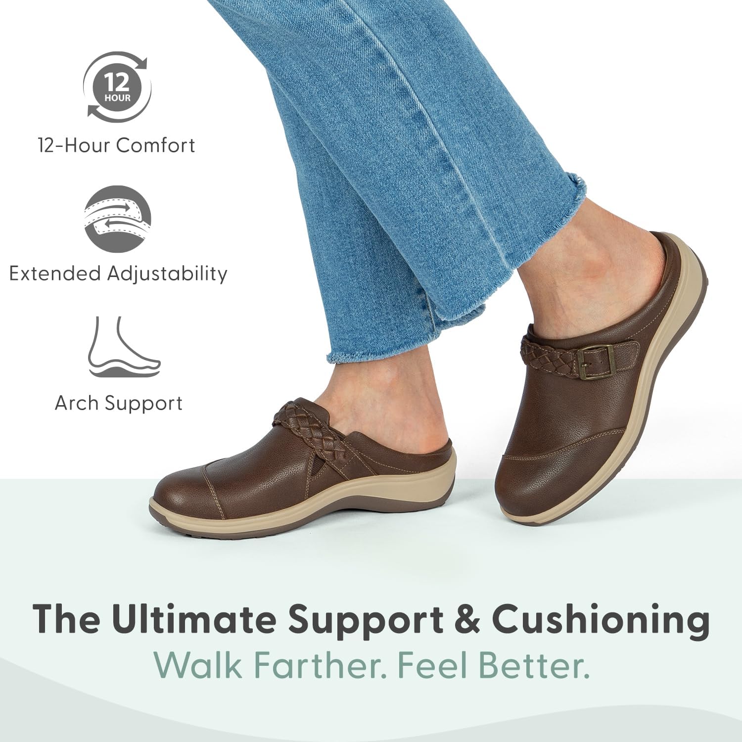 The clogs feature premium orthotic insoles with anatomical arch support, lightweight cushioning soles, non-binding uppers, and a roomy wide-toe box.