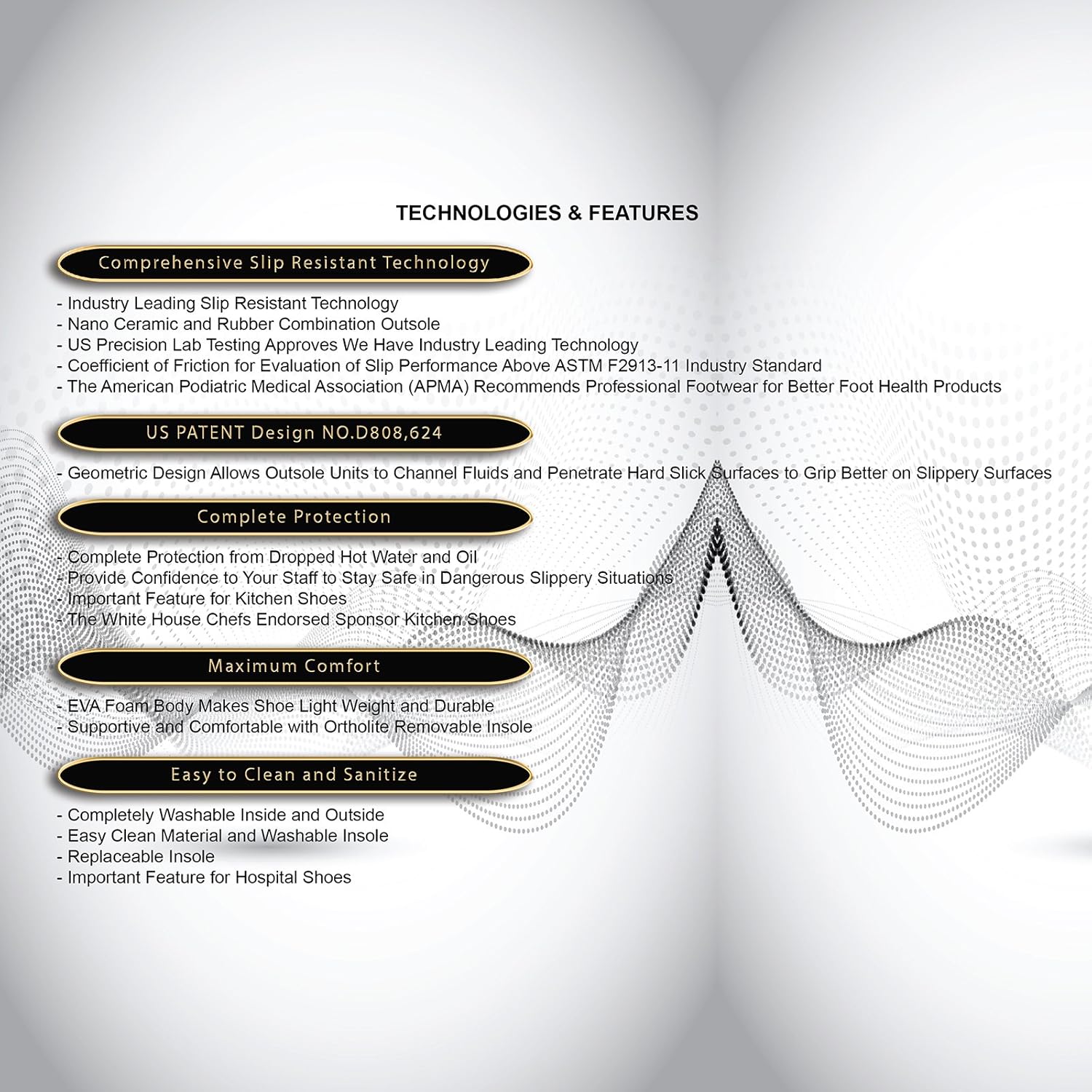 As a member of ASTM, all slip resistant shoes made per ASTM industry standard, coefficient of friction ASTM F2913-11 for evaluation of slip performance.