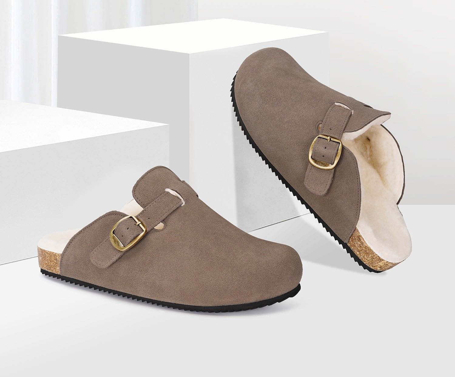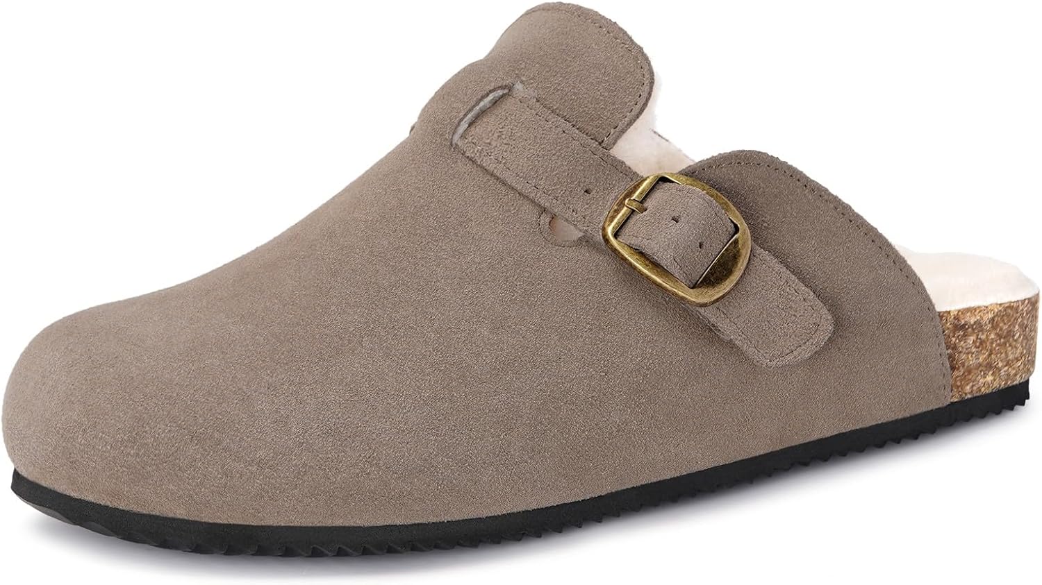 Womens Fur Lined Suede Clogs Mens Fuzzy Leather Mules Cork Footbed Slip On Winter Potato Shoes with Arch Support