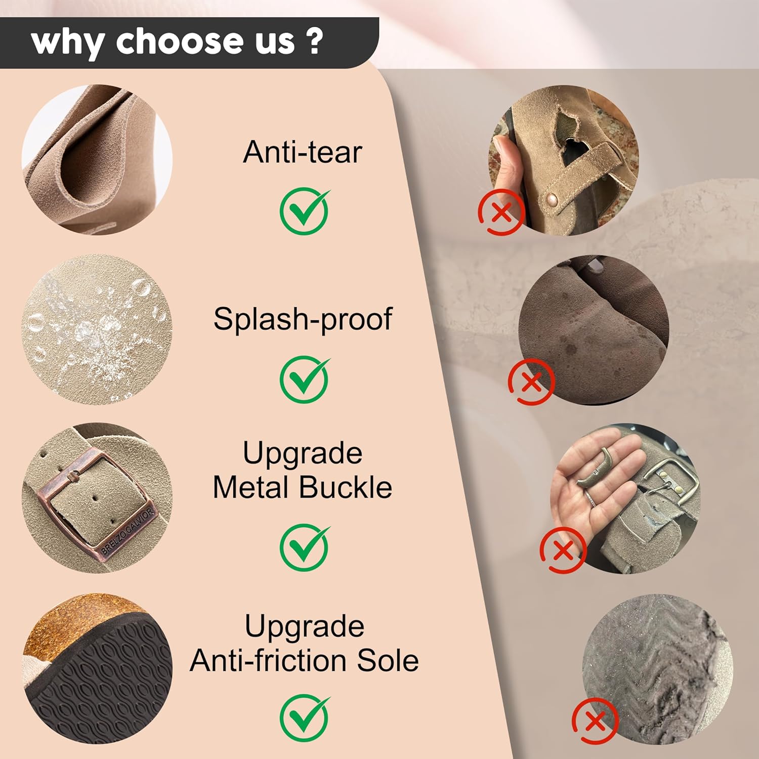 Women’s Suede Clogs Men’s Slip-On Mules Non-Slip Potato Shoes Arch Support Sandals with Adjustable Buckle for Indoor & Outdoor Use